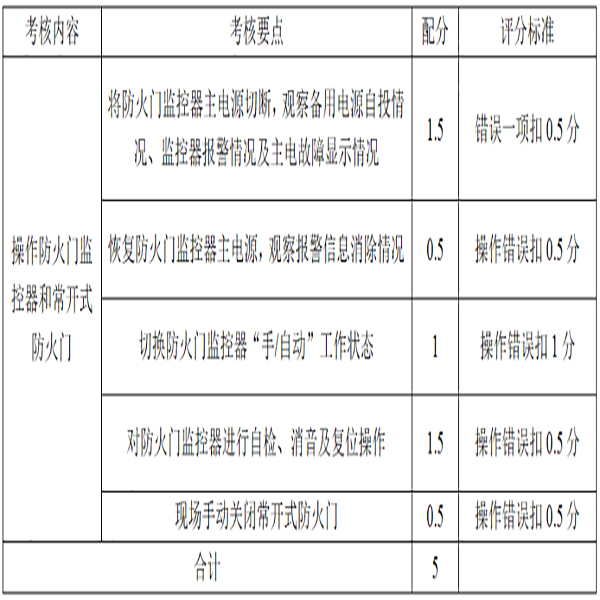 防火门操作考核内容防火门的操作方法。考核标准1.正确对防火门监控器主电和备电自动切换功能进行测试; 2.正确排除电源的故障状态; 3.正确判断并切换防火门监控器的手动/自动控制状态; 4.正确对防火门监控器进行自检、消音及复位操作; 5.正确现场手动关闭常开式防火门并查看信号反馈情况。 考核方式模拟操作或现场操作。