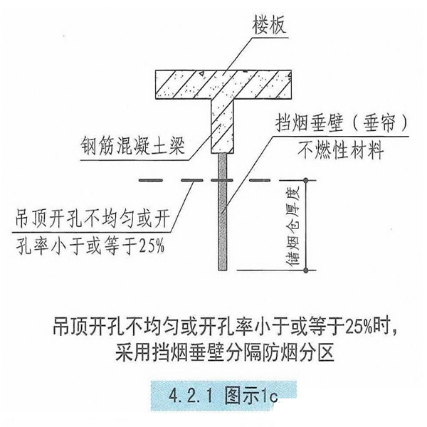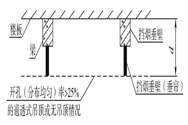 而设置通透吊顶(开孔率大于25%)的场所,起火时烟气会进入吊顶内,所以挡烟垂壁应从楼板下开始设置,挡烟垂壁的高度不应小于储烟仓厚度。