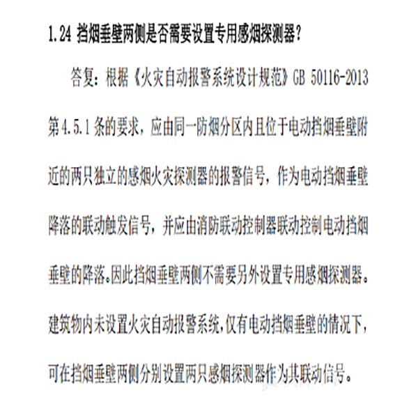 答复:根据《火灾自动报警系统设计规范》GB 50116-2013第 4.5.1 条的要求,应由同一防烟分区内且位于电动挡烟垂壁附近的两只独立的感烟火灾探测器的报警信号,作为电动挡烟垂壁降落的联动触发信号,并应由消防联动控制器联动控制电动挡烟垂壁的降落。因此挡烟垂壁两侧不需要另外设置专用感烟探测器。建筑物内未设置火灾自动报警系统,仅有电动挡烟垂壁的情况下,可在挡烟垂壁两侧分别设置两只感烟探测器作为其联动信号。