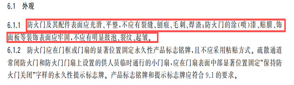 7.0.6条款:防火门表面加装贴面材料或其他装修时,不得减小门框和门的规格尺寸,不得降低防火门的耐火性能,所用贴面材料的燃烧性能等级不应低于B1级。
