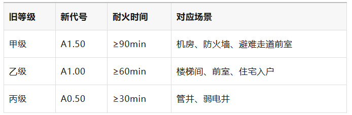 旧版按材质 + 甲乙丙等级划分,模糊易混淆;新版删除材质分类,直接按使用场景分为三大类,耐火等级用精确时间代号表示。